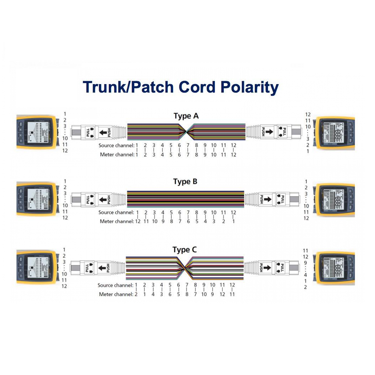 - Polaridad: Pueden ser fabricados en polaridad tipo A o tipo B. La polaridad A o directa es cuando se coloca la fibra 1 en la posición 1 del conector MPO, en ambos extremos del jumper y se conserva en toda la red. La polaridad B o inversa en un extremo del conector se invierte, así la fibra 1 de uno de los conectores se conectará en el orificio 12 del otro, 2 en 11 y así sucesivamente.